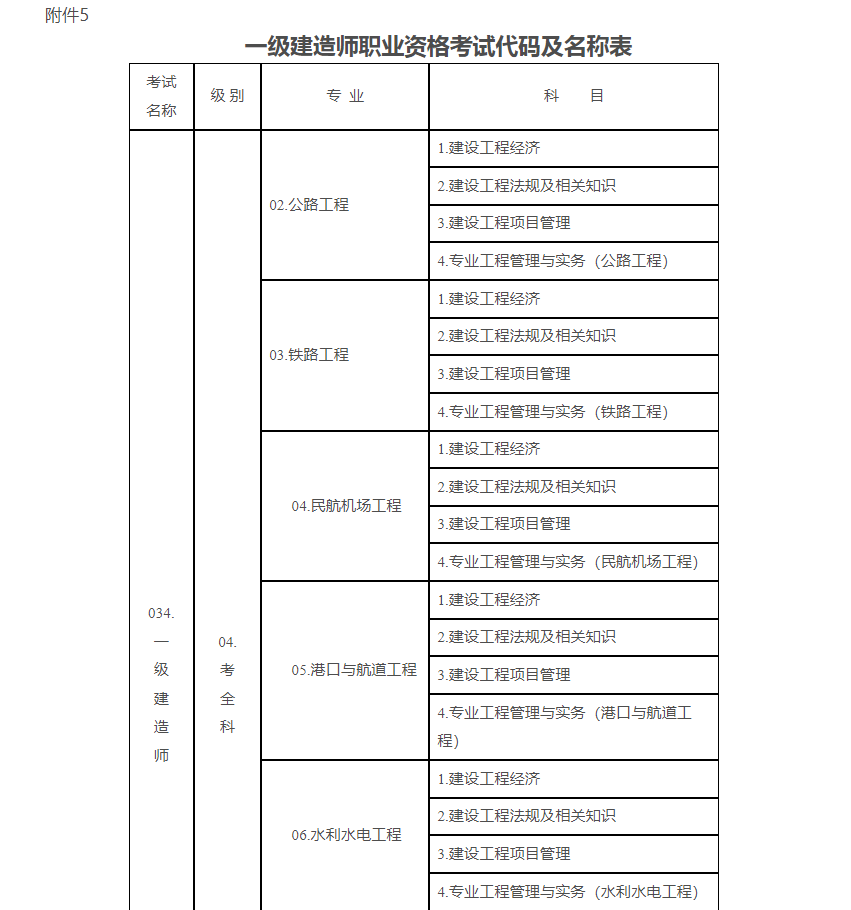 5.一級(jí)建造師職業(yè)資格考試代碼及名稱表
